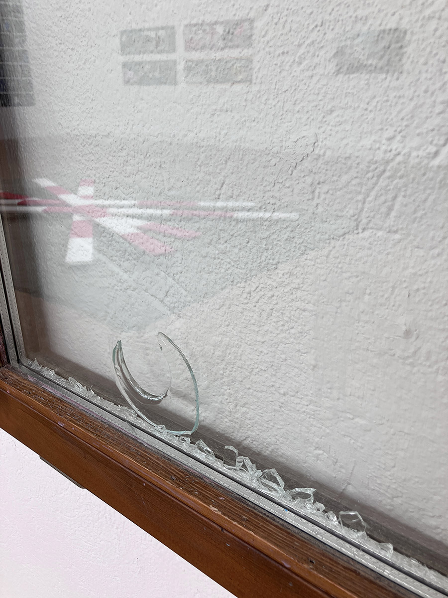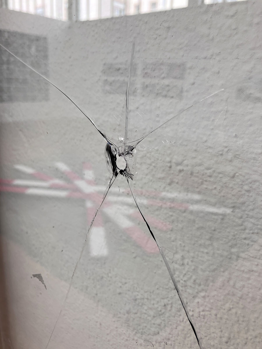 Fenster, 2025, zweiflügeligem Altbaufenster mit Hammerschlägen, 140 x 126 x 5 cm